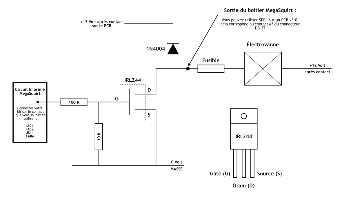 Le système de gestion moteur MegaSquirt-II peut piloter une électrovanne de gestion de pression de suralimentation à 3 voies. Cette fonction ne peut être activée que si vous utilisez un firmware MS2-Extra. Pour câbler le kit en vente dans la boutique de FenixEcu, utilisez le plan de câblage suivant :